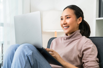Young cheerful woman sitting on sofa and using laptop computer at home.