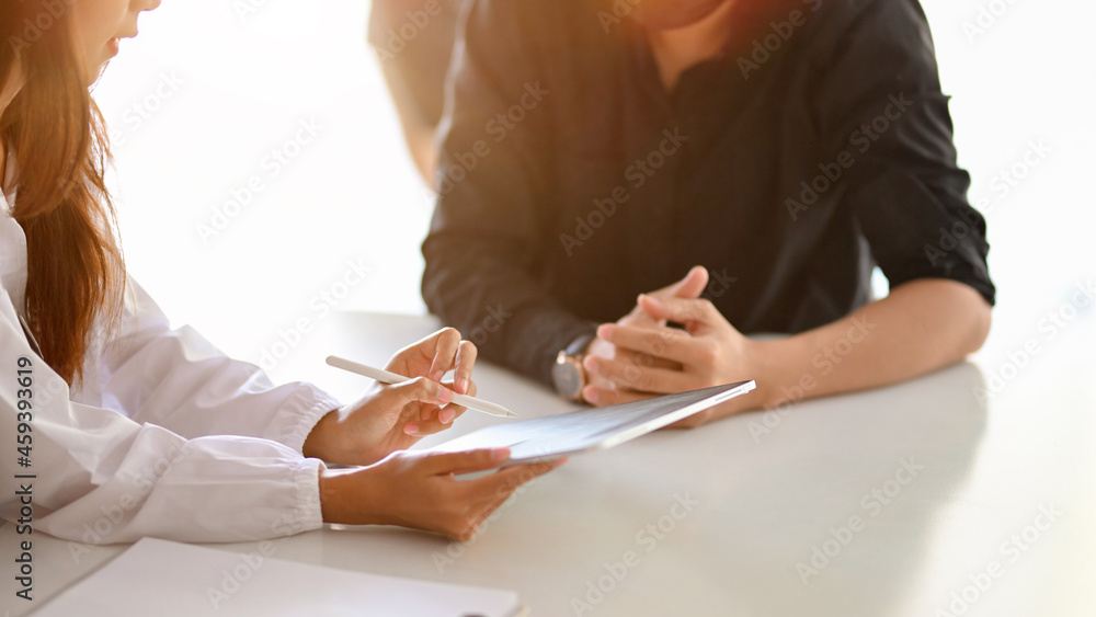 Doctor talking and giving surgery instructions on digital tablet for her patient