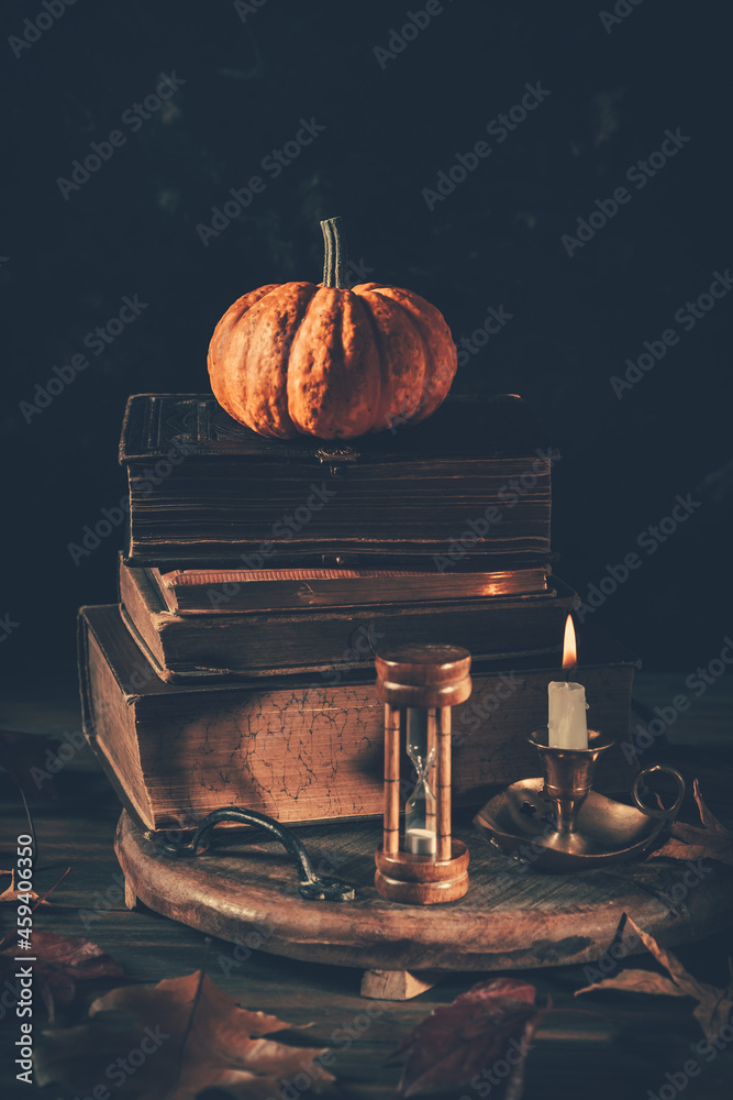 Still life for Halloween and Thanksgiving with old books, pumpkins and candle