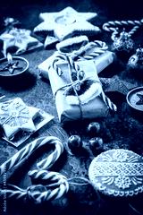 Holiday Christmas Gifts with Boxes, Candle and gingerbread cookies on dark blue