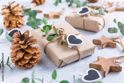 Holiday Christmas Gifts with Boxes, Coniferous, eucalyptus and ornaments
