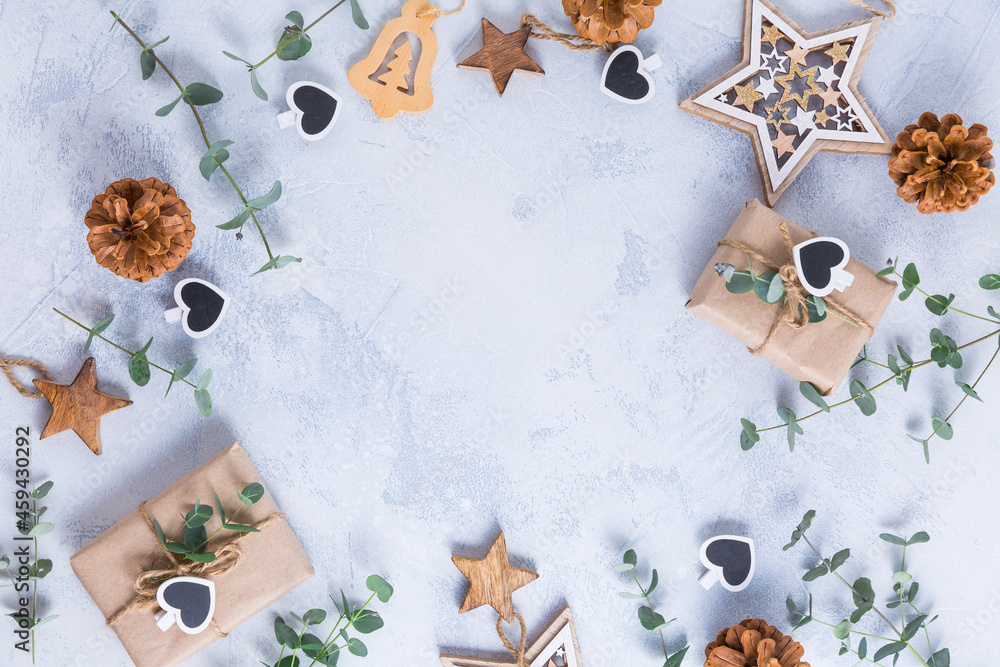 Holiday Christmas Gifts with Boxes, Coniferous, eucalyptus and ornaments