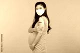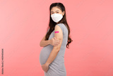 Pregnant Asian Woman wear face mask received anti virus vaccine cheerful with bandage isolated on pink background,Pregnancy of young woman enjoying with safety life after got COVID-19 vaccination