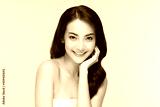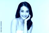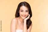Beautiful Asian young woman touching soft cheek smile with clean fresh skin Happiness and cheerful with positive emotional,isolated on Beige background,Beauty Cosmetics and Facial treatment Concept