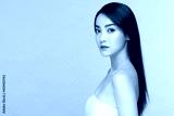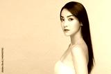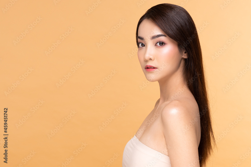 Side view of Beautiful Asian woman smile with clean and fresh skin Happiness and cheerful with positive emotional,isolated on Beige background,Beauty and Cosmetics Concept
