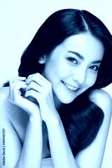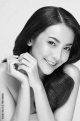 Beautiful Asian woman looking at camera holding hands smile with clean and fresh skin Happiness and cheerful with positive emotional,isolated on white background,Beauty and Cosmetics Concept