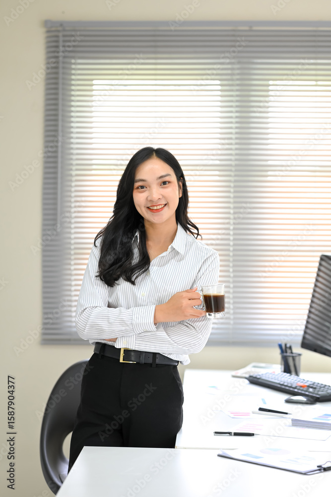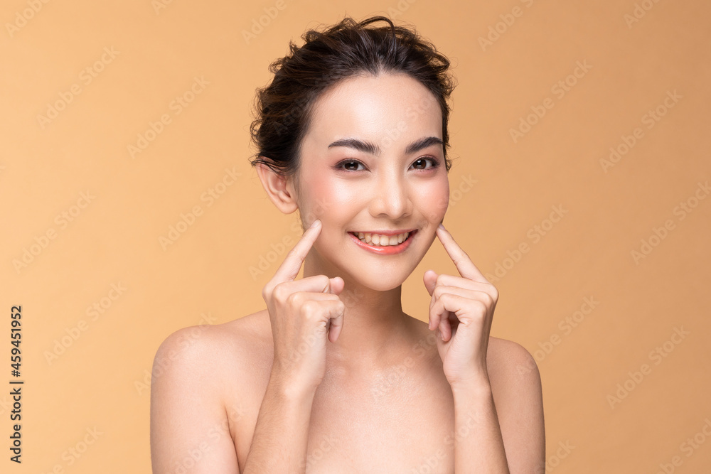 Beautiful Asian young woman touching soft cheek smile with clean fresh skin Happiness and cheerful with positive emotional,isolated on Beige background,Beauty Cosmetics and Facial treatment Concept