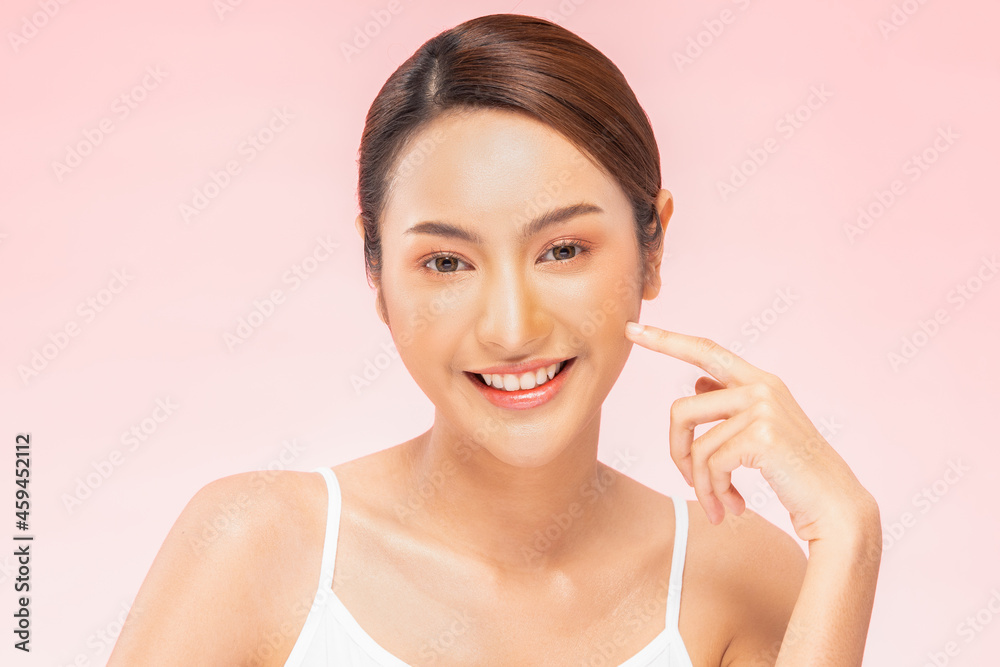 Young Beautiful Asian woman smile touching soft cheek with clean and fresh skin Happiness and cheerful with positive emotional,isolated on pink background,Beauty Cosmetics and spa Treatment Concept