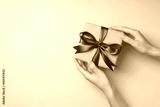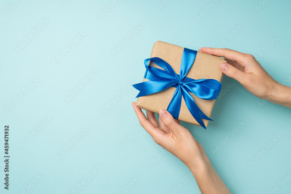 First person top view photo of woman's hands holding craft paper giftbox with blue satin ribbon bow on isolated pastel blue background with copyspace