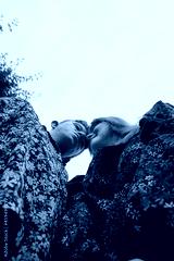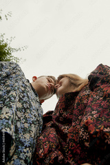 Low angle portrait of young couple with Down Syndrome and Foetal Alcohol Syndrome holding hands and heads touching