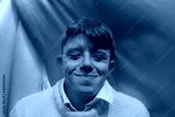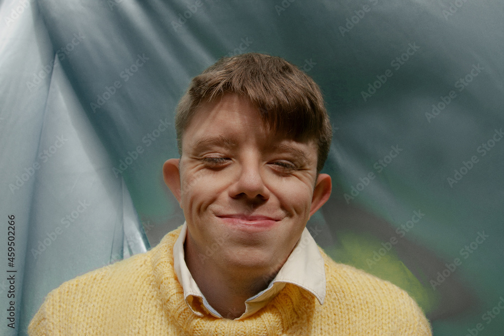 Portrait of young man with Foetal Alcohol Syndrome smiling in front of blue background