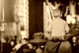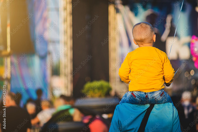 A boy in a yellow T-shirt sits on his dad's shoulders at a concert.