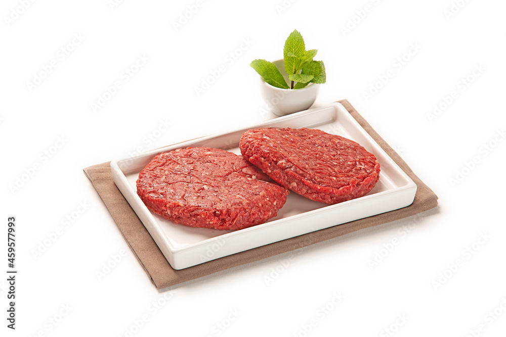 hamburguesa de ternera cruda fresco en plato blanco. aislado fondo blanco