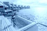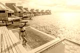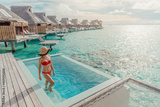 Luxury hotel woman relaxing in infinity swimming pool of private overwater bungalow suite enjoying summer vacation. Tourist with hat and red swimsuit in water sunbathing.