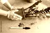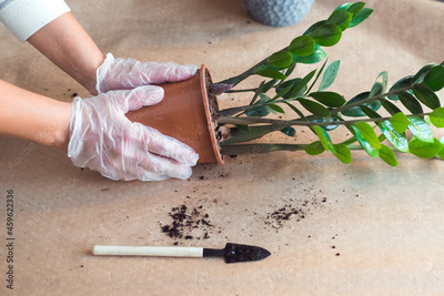 replanting a zamiokulkas flower, woman's hands holding homeplant