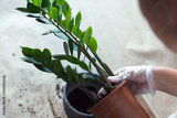 replanting a zamiokulkas flower, woman's hands holding homeplant