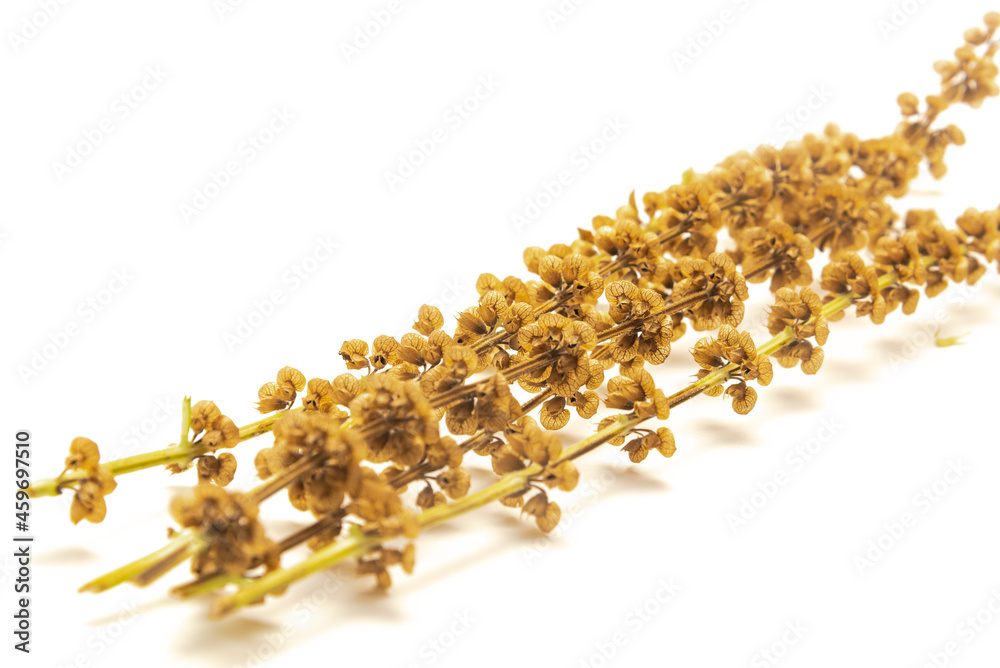 Homegrown Italian sweet basil seed pods on dried flowers isolated on white for seed saving concept