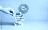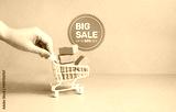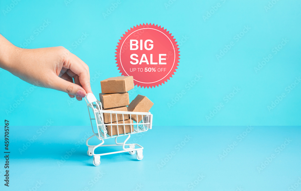 Marketing promotion with big sale text on tag and products box order on trolley.