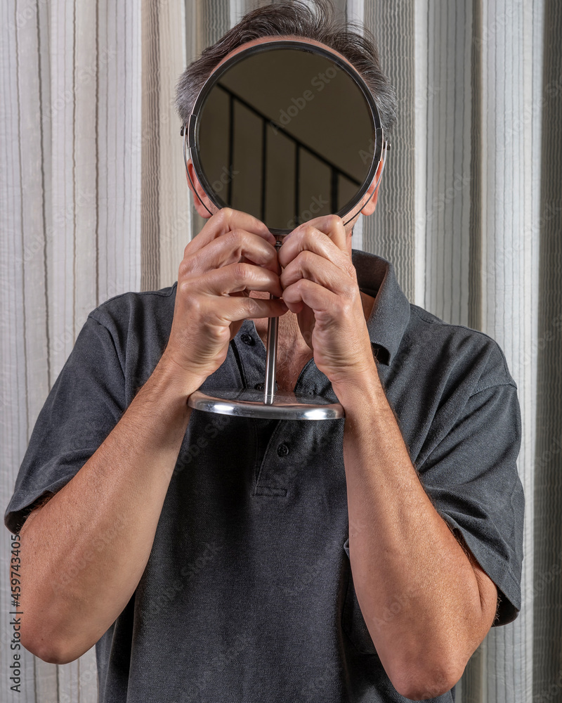 A man covers his face with a round mirror on which the railing of a staircase is reflected