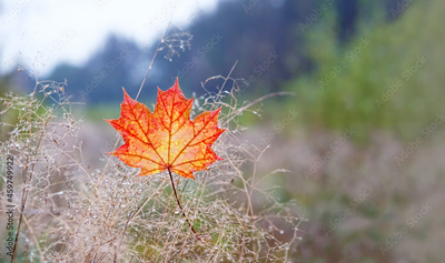 autumn maple leaf and grass, natural background. symbol of autumn season. beautiful fall time.