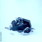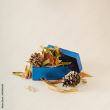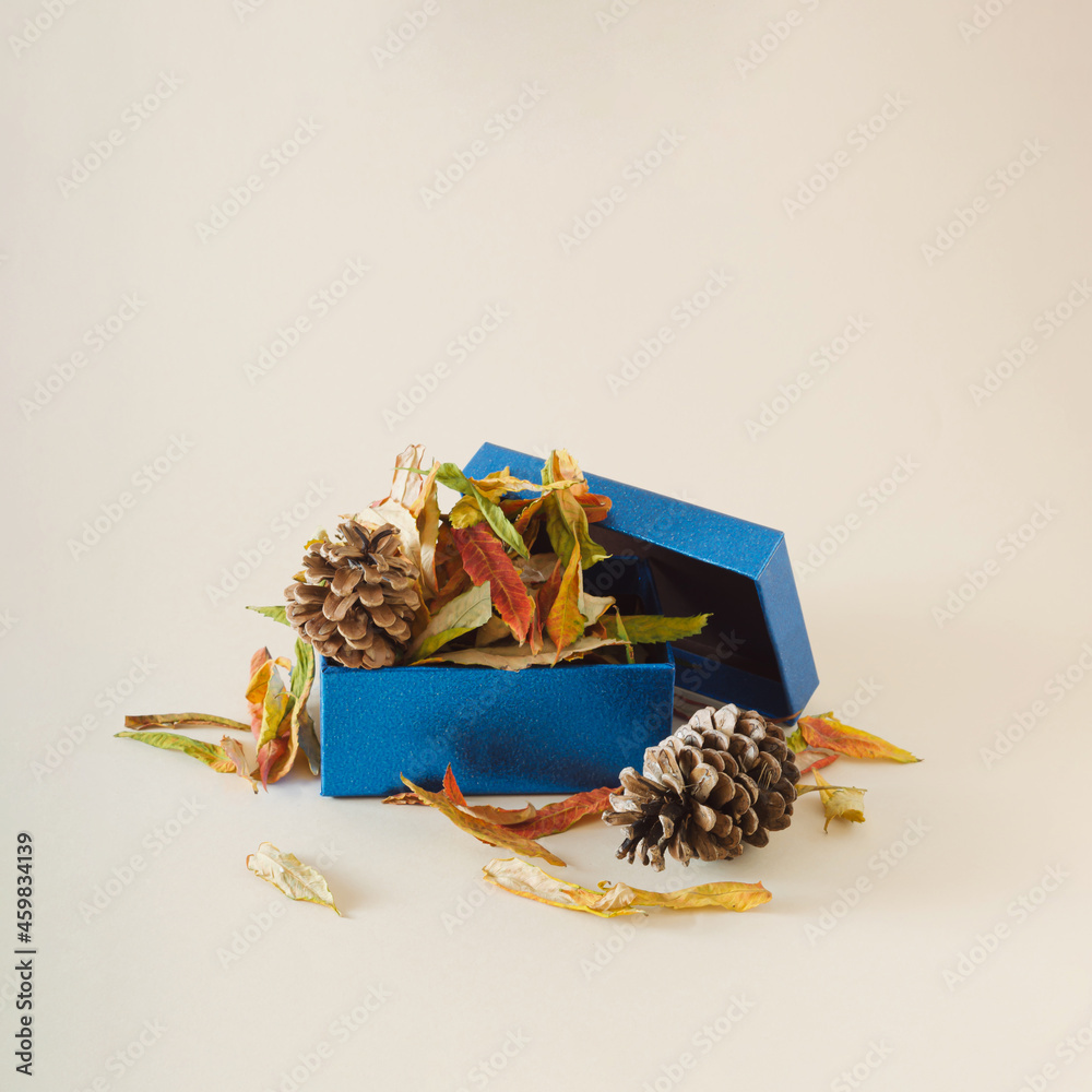 Autumn leaves and pinecone in a blue gift box on a cream background. Fall concept