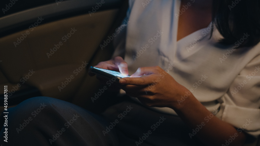 Successful young Asia businesswoman in fashion office clothes working late using smart phone in sitting back seat of car in urban modern city in night. People occupational burnout syndrome concept.