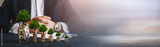 Businessman holding coin with tree growing on money coin stack. Green business growth. Finance sustainable development. Panoramic banner.