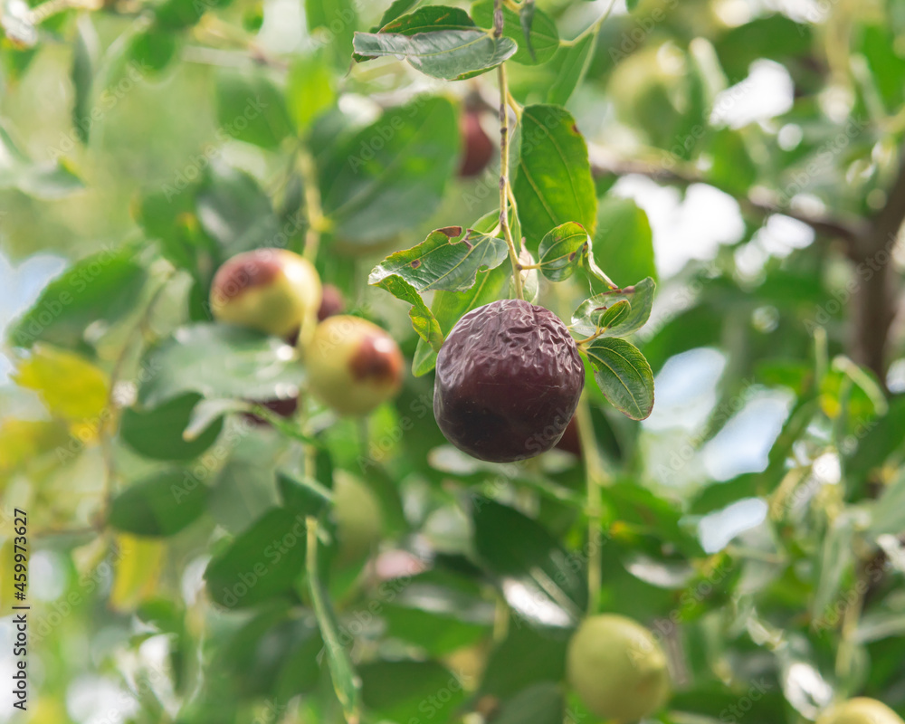 Ripe and green jujube fruits or Chinese dates on tree at home garden in Arlington, Texas, USA