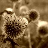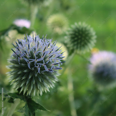 Echinops ritro flowers in the garden. Blue globe thistles plants on summer