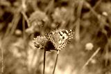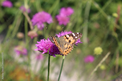 Orange and black butterfly on a pink wildflower in the garden. Vanessa cardui butterfly on a flower