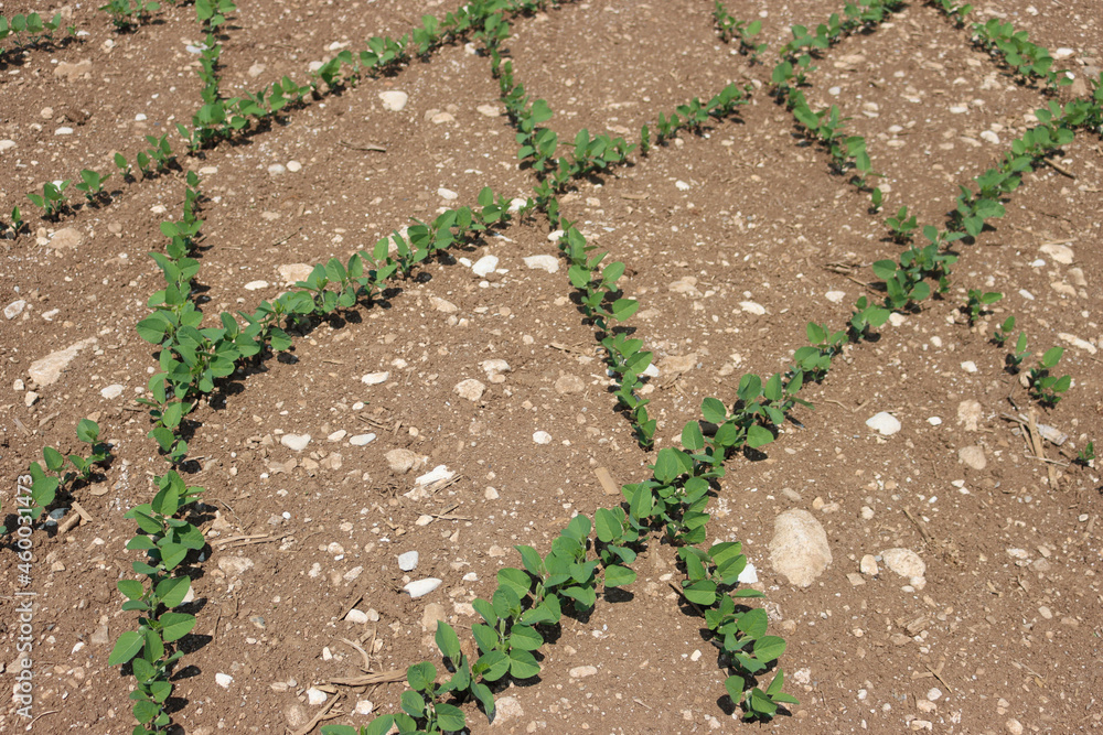 Green Soybean plants growing in rows in the field.. Cultivated Glycine max field on springtime
