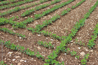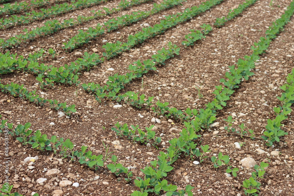 Green Soybean plants growing in rows in the field.. Cultivated Glycine max field on springtime
