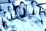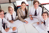 overhead view of high school teacher and students in classroom