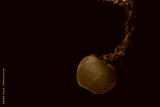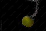 Fresh fruit fall into the cold water with air bubbles as symbol for healthy vegan lifestyle in short time exposure of high speed camera