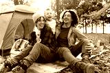 young happy family portrait camping outdoor with tent in autumn nature. mom, dad and little child having picnic into the wild. people having fun together hugging each other smiling. lifestyle concept