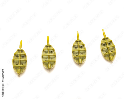 Plastic quick release mound and group of Inline flat feeder with swivel for carp fishing bait holder tool isolated on white
