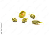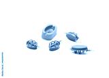 Plastic quick release mound and group of Inline flat feeder with swivel for carp fishing bait holder tool isolated on white