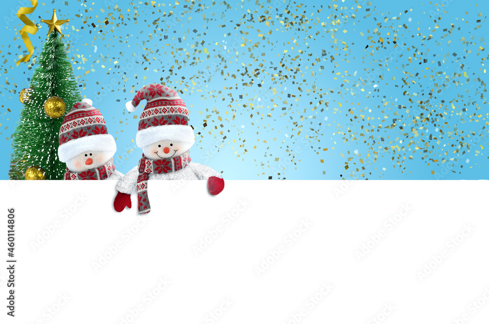 Two Cute Snowmen with blank banner on blue background with gold foil confetti.