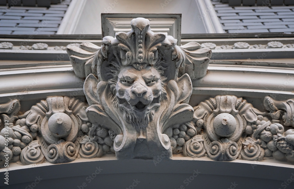 Bas-relief in shape of a muzzle lion, beautiful stucco decor. Lion head molding on old house wall facade.