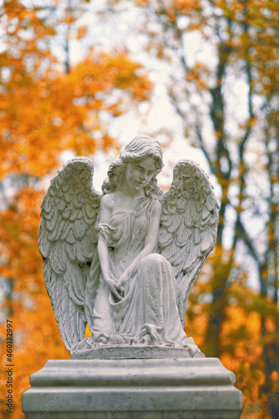 Angel statue on old cemetery, autumn natural background. Design for condolences, mourning cards or obituary. concept of religion, faith, Remember, mourn, memory. all saints day