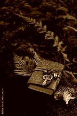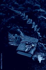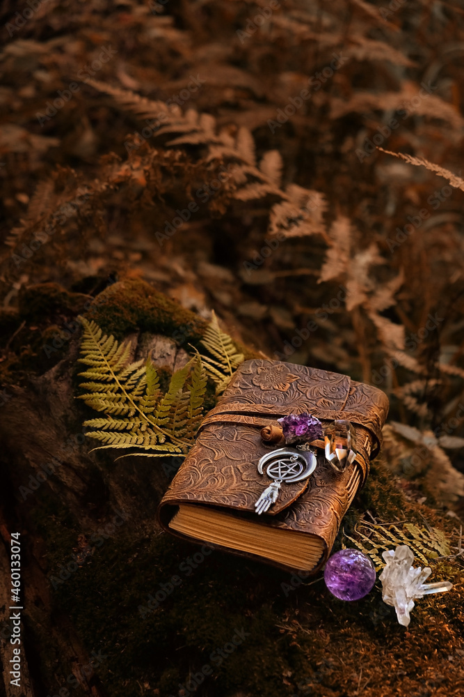 Witch book, gemstones minerals, amulet on dark natural forest background. magical esoteric ritual. Mysticism, divination, wicca, occultism, Witchcraft concept