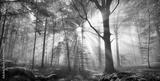 Enchanting sun rays falling through the mist in a golden forest in autumn. The beauty of nature in vibrant warm autumnal colors of deciduous trees