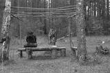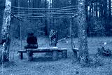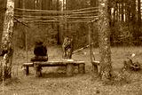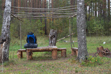 bushcraft camp, table and benches made of logs, there is a tourist backpack nearby
