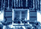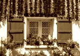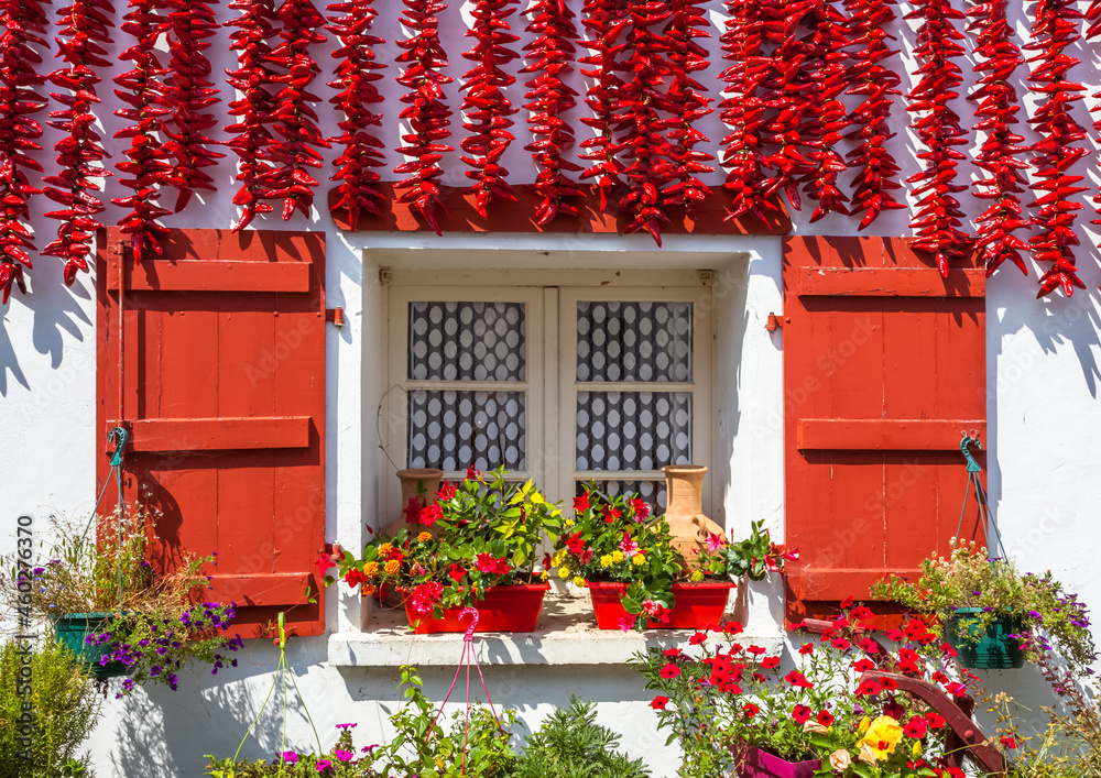 Séchage de piments sur façade de maison à Espelette en pays basque, France