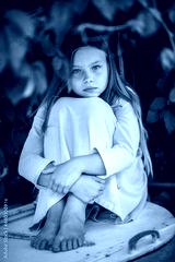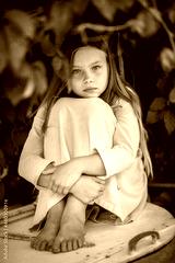 Beautiful young girl is dreaming sitting on the well covered with ivy. Image with selective focus and toning