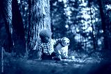 Small kid in blue cap with white dog puppy breed jack russel terrier in autumn forest. Childhood with pets concept