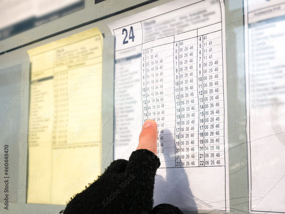 Man checking the bus or tram timetable pointing his finger on the arrival departure hours table. Commute, city transport, urban transportation schedule simple concept, hand closeup
