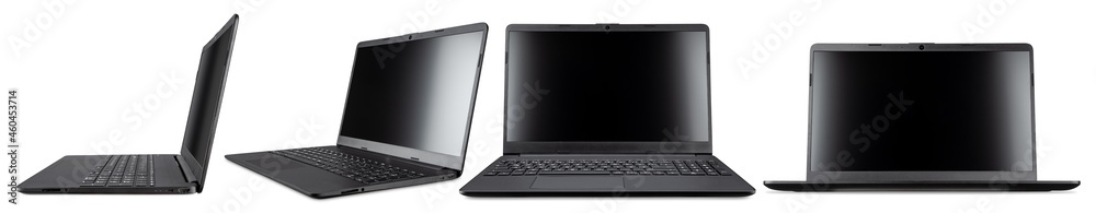 set collection of modern open black mobile laptop notebook computer with copy space and blank screen in front side view isolated white background. business technology concept