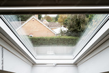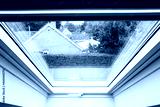 Abstract view of a newly installed skylight window in a loft conversion. Distant bungalows can be seen on a raining day.