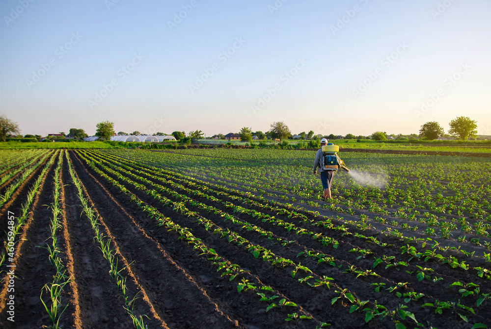 Farmer sprays a potato plantation with a sprayer. Effective crop protection of cultivated plants against insects and fungal. Chemical treatment. Mist sprayer, fungicide and pesticide. Working on field